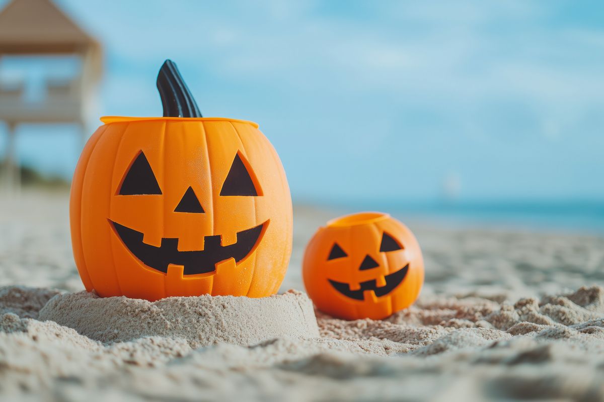 Decorate your storefront, office, restaurant, or a featured area inside with a blend of Halloween and summer items: